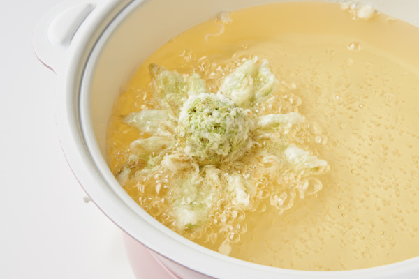 - ふきのとうを⑦にくぐらせ、花の部分を下にして⑧に入れる。
