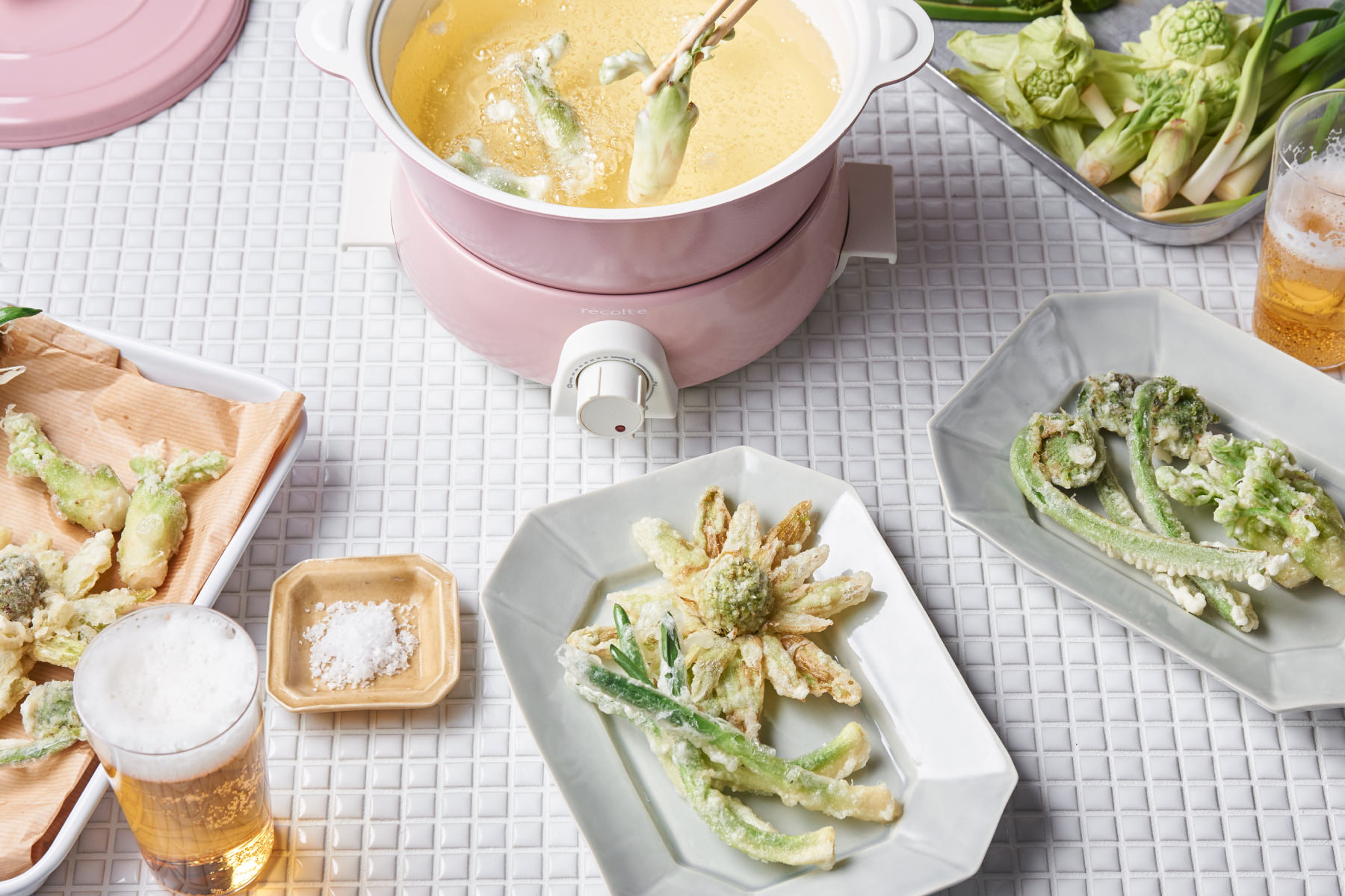 春は山菜。その個性的な味と香りはこの時期限定のおいしさです。一度にいろいろな山菜を味わうなら、アク抜きせずに調理ができる天ぷらがおすすめ。さくっとした食感の後に広がる独特のほろ苦さ。そして、青い香りの余韻がたまりません。今回はからりと揚がるよう、天ぷら衣に片栗粉を加えました。[ポットデュオ フェット]で、揚げたそばからビールとともにほおばって、大人だから楽しめる苦味を楽しんで!