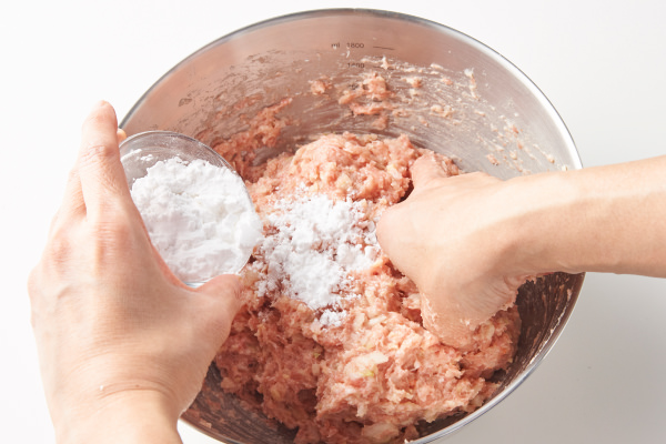 - たねの片栗粉は後から加えることで、食材の水分や下味を閉じ込め、旨みが凝縮してよりおいしく、プリッとした食感になります。
