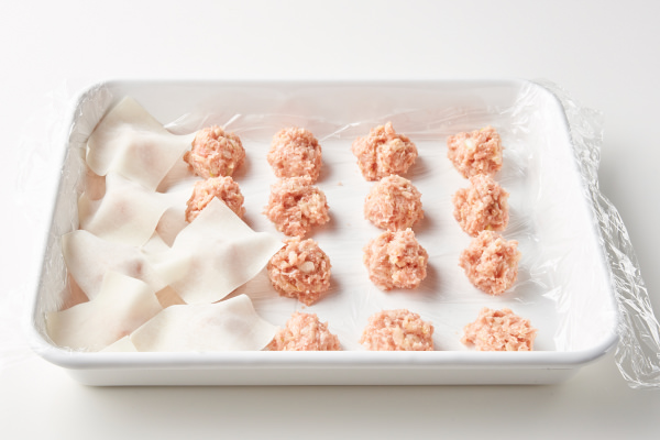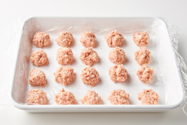 - バットにラップをひき、たねを約20gずつに分けて並べる。