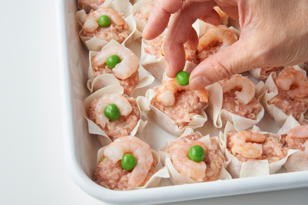 ジューシーな肉だねのなかにシャキシャキした歯ざわり。シュウマイは、たけのこが入るとぐっと軽やかに食べられます。蒸し器がなくても大丈夫。[ホームバーベキュー]が、ふっくらおいしく蒸し上げてくれます。しかも、餃子みたいにきっちり包まなくてもいいし、ぶかっこうでもおいしく見えるのがシュウマイの素敵なところ。今回のたねは具だくさんですが、小ぶりなので短時間で作れます。