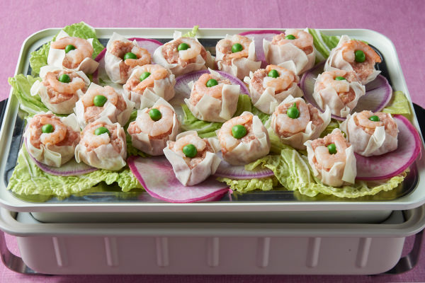 - [ホームバーベキュー]で作るこのシュウマイは加熱前からシュウマイをセットしてOK。蒸気があがるまで待つ必要はありません。