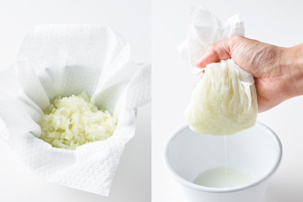 - ⑥を取り出し、塩を加えて軽くもみ、キッチンペーパーに包んで水分を優しく絞る。⑤のボウルに加える。