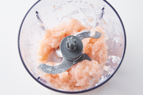 - むきえびを[カプセルカッター キャトル]に入れ、連続プッシュしてミンチ状にする。⑦のボウルに加える。(★POINT)