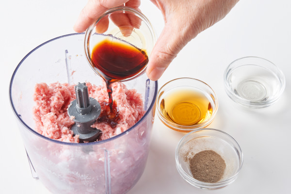 - 豚こま切れ肉を[カプセルカッター キャトル]に入れ、連続プッシュしてミンチ状にする。【A】を加え、全体がよく混ざるまで、さらに連続プッシュしたら、⑧のボウルに加える。(★POINT)