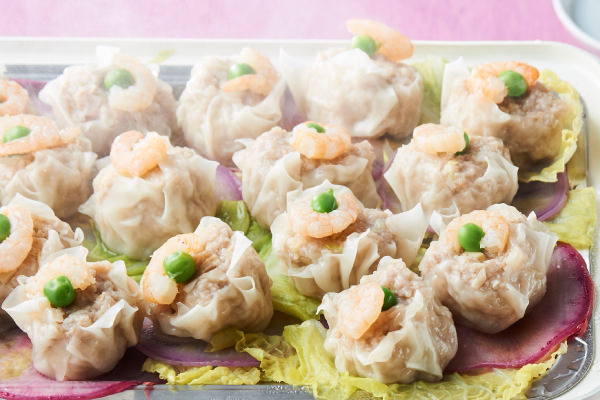 - 蒸すときに野菜を敷いておくと、シュウマイがプレートにくっつくのを防ぎます。好みの野菜を使い、ぜひ、シュウマイと一緒に食べてください。野菜の代わりにオーブンペーパーをひいてもOKです。