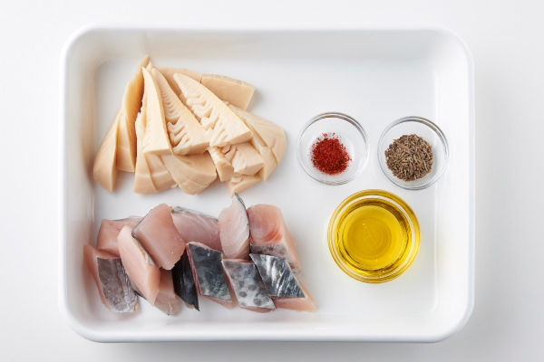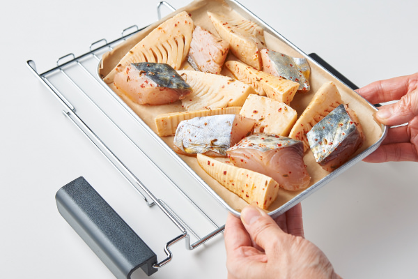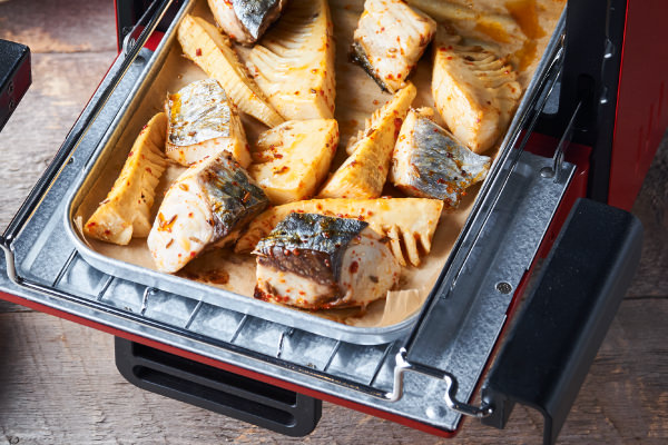 春の魚と書く鰆(サワラ)とたけのこ。春が旬の食材同士は相性がよし。この組み合わせは煮物が定番ですが、今回はスパイシーに味つけしてエスニック風に仕上げました。サワラは身が崩れやすい魚ですが、[スライドラックオーブン デリカ]ならトレイに入れて焼くだけでおいしいグリル料理に! 15分放っておくだけで、崩れずきれいに焼きあがります。休日の午後の軽いおつまみにも最適です♡