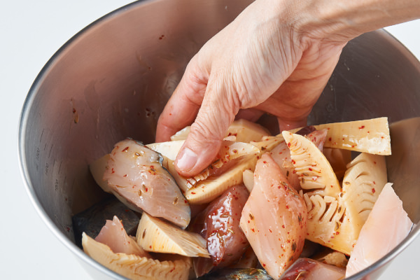 - ③にたけのことサワラを加え、全体を優しく混ぜ合わせ、5分ほどマリネする。