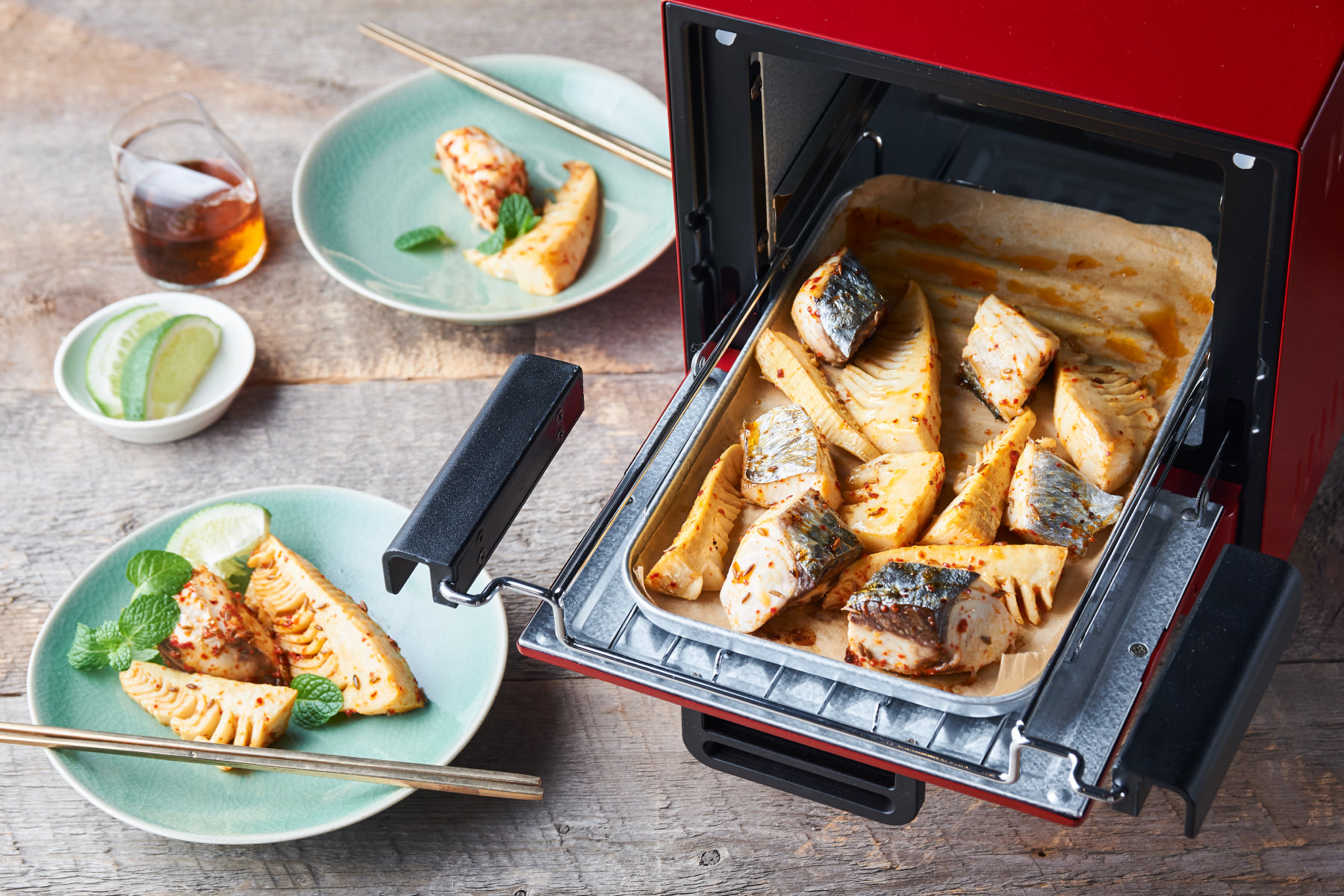 春の魚と書く鰆(サワラ)とたけのこ。春が旬の食材同士は相性がよし。この組み合わせは煮物が定番ですが、今回はスパイシーに味つけしてエスニック風に仕上げました。サワラは身が崩れやすい魚ですが、[スライドラックオーブン デリカ]ならトレイに入れて焼くだけでおいしいグリル料理に! 15分放っておくだけで、崩れずきれいに焼きあがります。休日の午後の軽いおつまみにも最適です♡