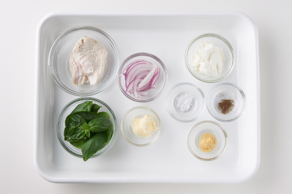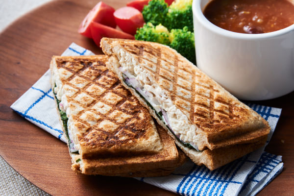 バジルチキンをホットサンドにぎゅっと詰めるイメージで。チキンサラダはマヨネーズの代わりに水切りヨーグルトで和え、全粒粉の食パンで挟んでよりヘルシーに。赤玉ねぎのしゃっきり感、ヨーグルトとバジルのさっぱり風味が後を引くおいしさです。