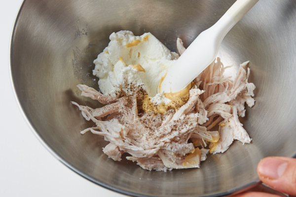 - 鶏むね肉は手でほぐす。