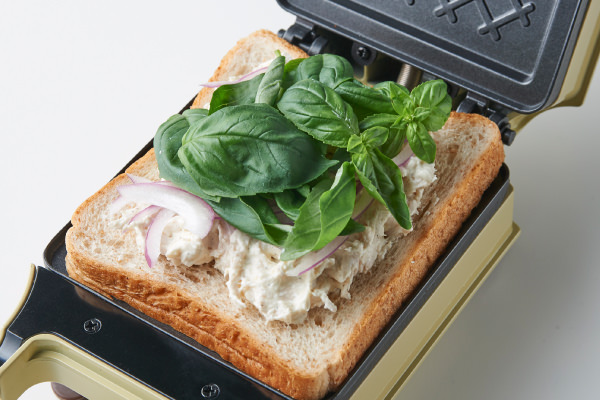 - 1枚の食パンの、バターを塗った面を下にして置き、④、赤玉ねぎ、バジルを順にのせ、予熱が完了した[プレスサンドメーカー キルト]にセットする。