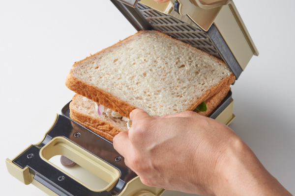 - もう1枚の食パンの、バターを塗った面を上にしてのせ、上側のパンがずれないように軽く押さえながらカバーを閉じる。