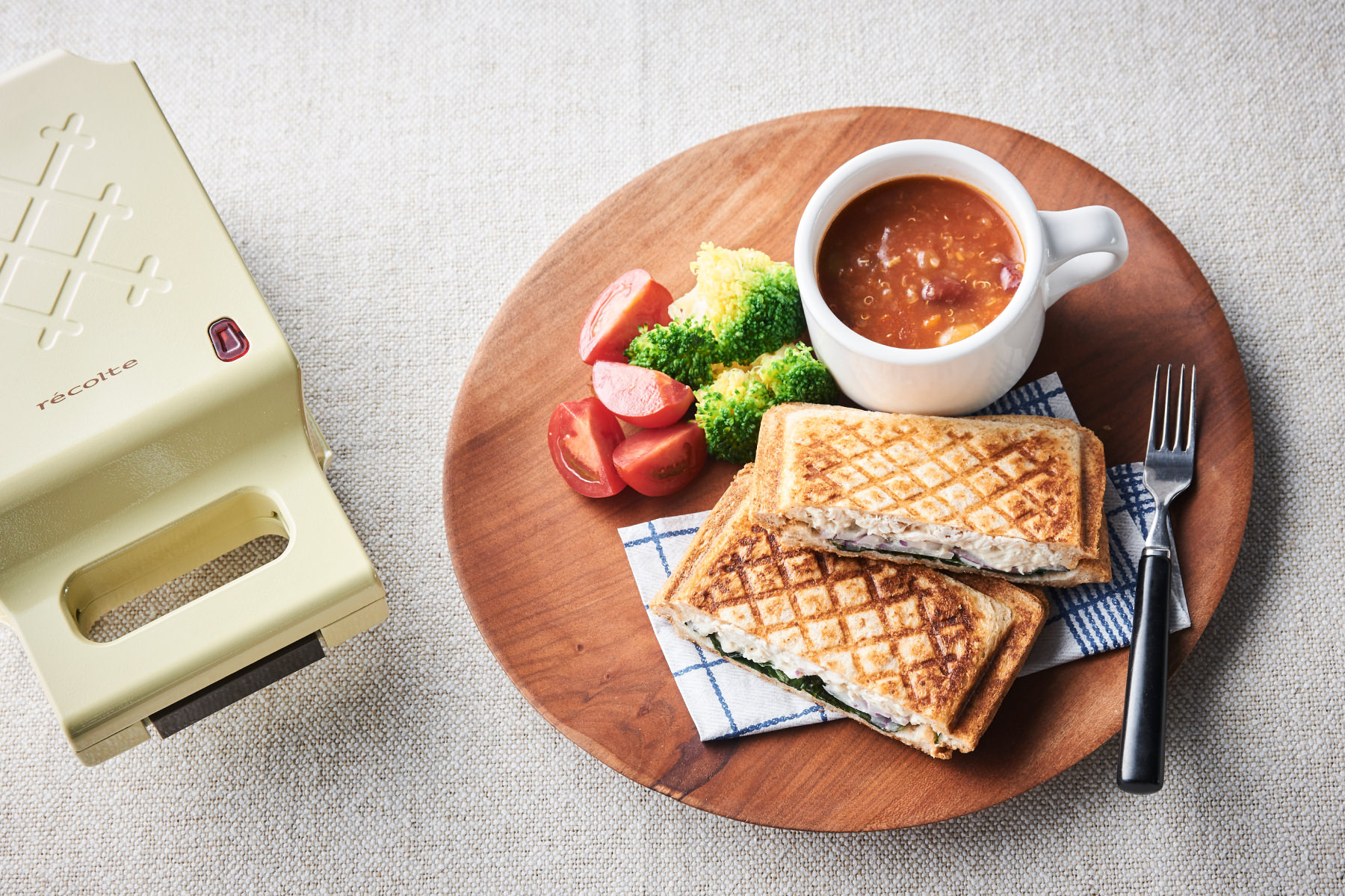 素材のおいしさを引き出すシンプルレシピが評判の村山由紀子さんによる連載。5月のテーマは「ホットサンド」。おしゃれでおいしいホットサンドは、朝ごはんやランチ、来客時の簡単なおもてなしなどにいつでも大活躍♡ でも、レシピがマンネリ…という人もいるのでは? そこで今回は、[プレスサンドメーカー キルト]で作る素敵な具材のレシピをご紹介。メイン食材とハーブの組み合わせも必見です。そして今回のレシピには、村山さん流のちょっとしたコツが。それは焼く前に、「パンの外側(キルトのプレートがあたる部分)にバターやオイルを塗る」こと。このひと塗りで、焼き上がりがよりカリッとなります!