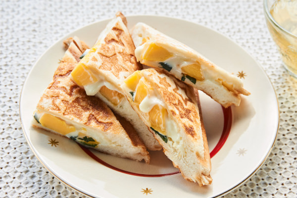 レモン風味のクリームチーズディップをたっぷりはさんだ、デザート感覚で食べられるホットサンド。粉砂糖を加えたクリームチーズディップとマンゴーのとろける甘さに、ペパーミントで爽やかさをプラス。甘いだけじゃないから夏にぴったり。冷やして食べてもおいしい!