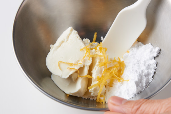 - 【クリームチーズディップ】を作る。クリームチーズとレモンの皮、粉砂糖を混ぜ合わせる。