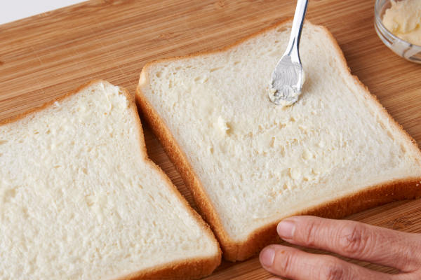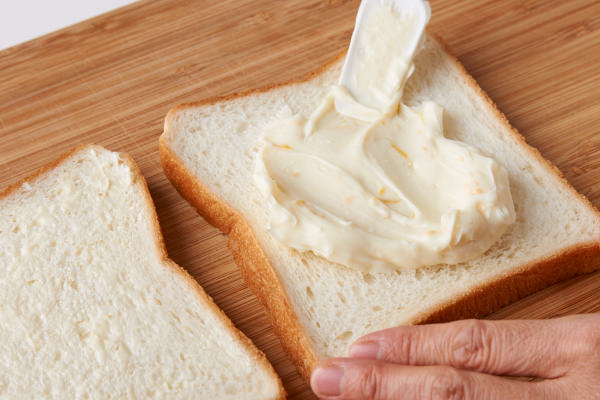 - 食パン1枚にのみ、バターを塗っていない方の面に③を塗る。