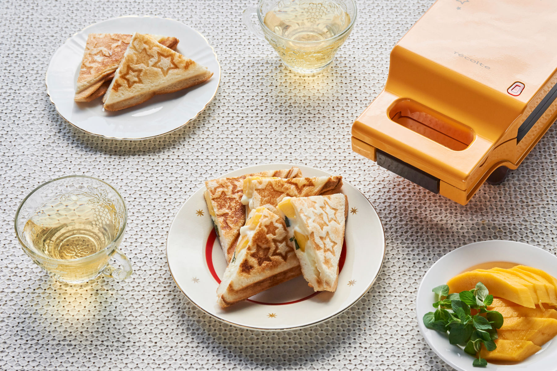 - ⑤のクリームチーズディップを塗った面を上にして置き、上にマンゴーを並べ、ペパーミントの葉を散らし、予熱が完了した[プレスサンドメーカー キルト]にセットする。