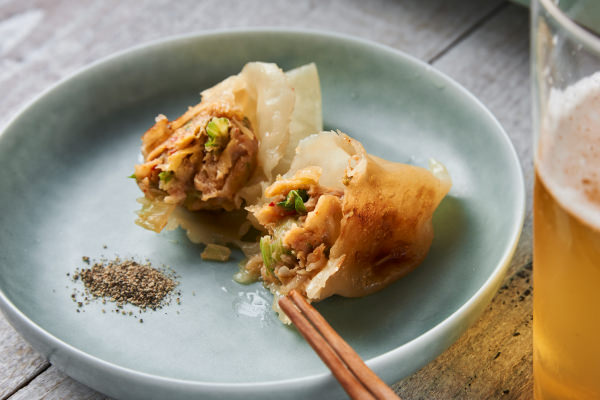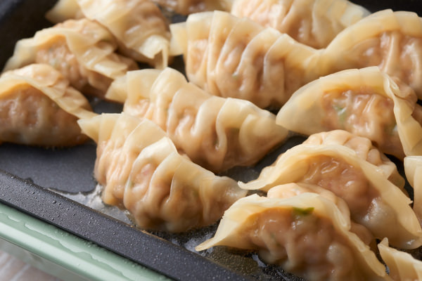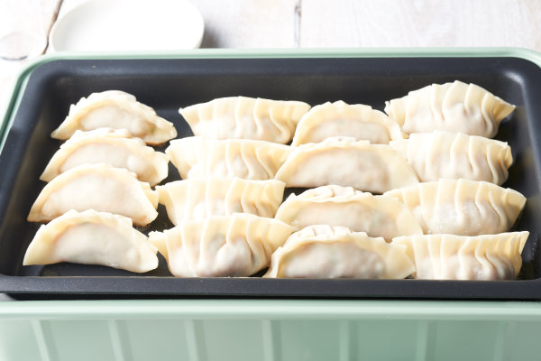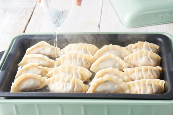 栄養バランスがよく、「完全食」ともいわれる餃子は、ダイエット食としても人気のメニューです。今回、餃子あんに使ったのは発酵食品としておなじみのキムチと、シャキシャキ食感が楽しめるセロリ。餃子の具によく使われるにんにくは、キムチに入っているから十分! 餃子あんは[カプセルカッター キャトル]で下ごしらえをし、皮で包んだら、[ホームバーベキュー]をスタンバイ。テーブルで焼いてアツアツをいただきます。キムチのぴりっと感、セロリの清涼感で、さっぱりジューシーな焼き餃子。これはハマります。ダイエット食として食べる方は食べすぎに注意です!