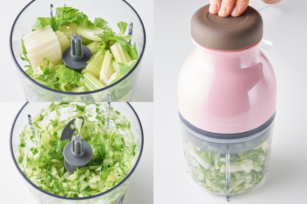 - 【餃子】のあんを作る。セロリを適当な大きさに切り、[カプセルカッター キャトル]に入れ、パルスプッシュを数回してみじん切りにする。