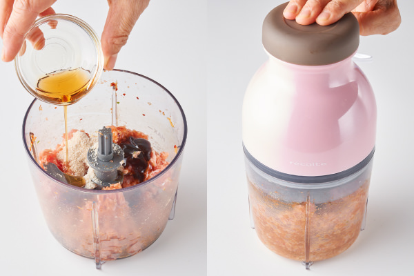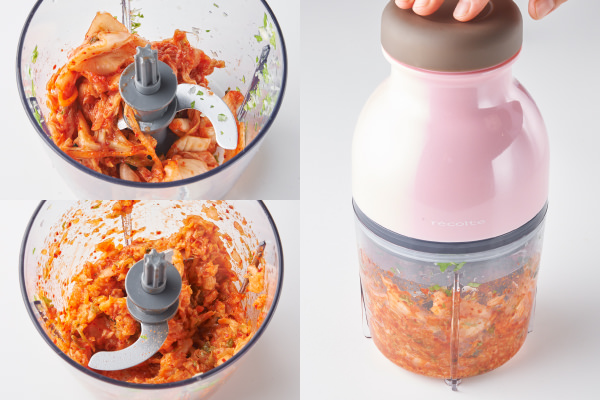 - キムチをざく切りし、[カプセルカッター キャトル]に入れ、パルスプッシュを数回してみじん切りにする。(POINT★3)