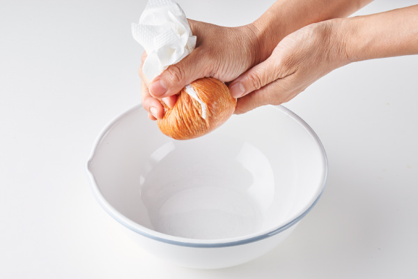 - キムチをキッチンペーパーに包み、水分を優しく絞る。(POINT★2)