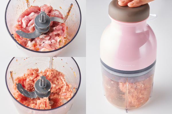 - 豚こま切れ肉を[カプセルカッター キャトル]に入れ、ミンチ状になるまで連続プッシュする。(POINT★3)