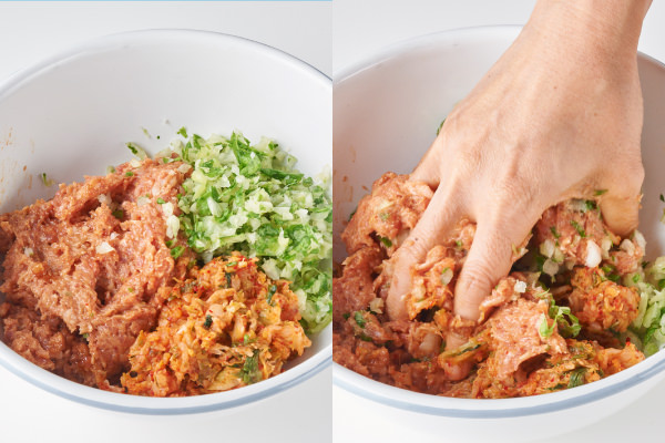 - ⑧をボウルに移し、④と⑥を加え、全体が均一になるまで手で混ぜ合わせる。