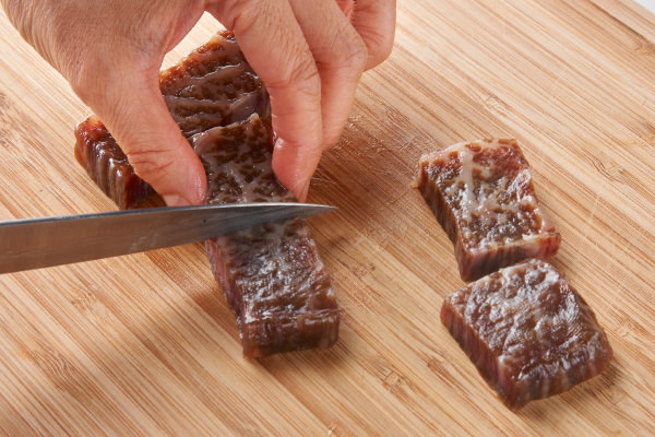 - 塊肉を使うと火入れに時間がかかり、肉の表面がみそで焦げやすくなるため、ステーキ肉がおすすめです。