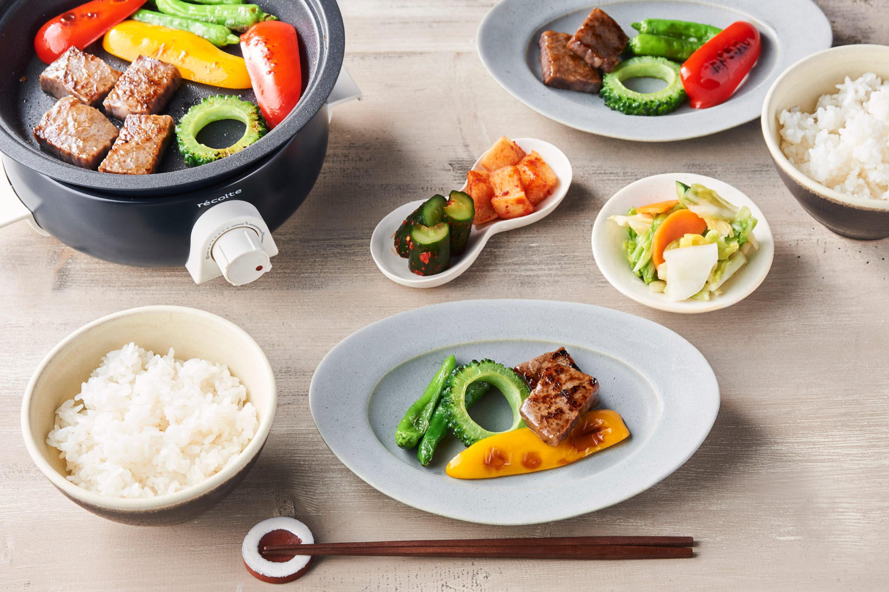 - [ポットデュオ フェット]に[グリルプレート]をセットする。サラダ油をひき、ツマミを[2]にして加熱する。肉や野菜を焼き、火が通ったらできあがり。