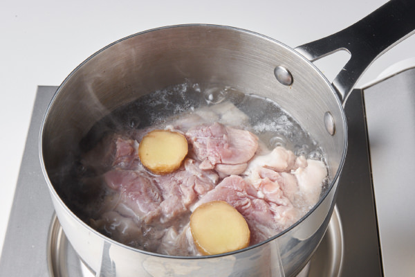 - 【蒸し鶏サラダののっけ麺】の蒸し鶏を作る。鍋に鶏もも肉と【A】、肉がかぶるくらいの水(分量外)を入れ、強火にかける。