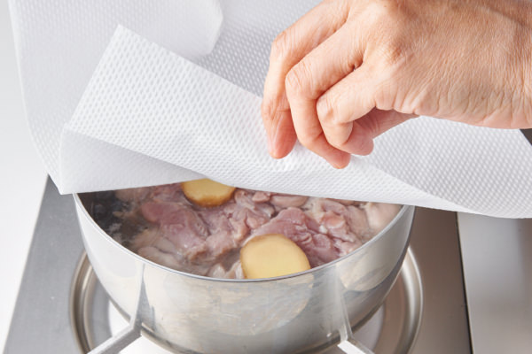 - キッチンペーパーで落としぶたをすることで、鶏肉のアクが取れます。