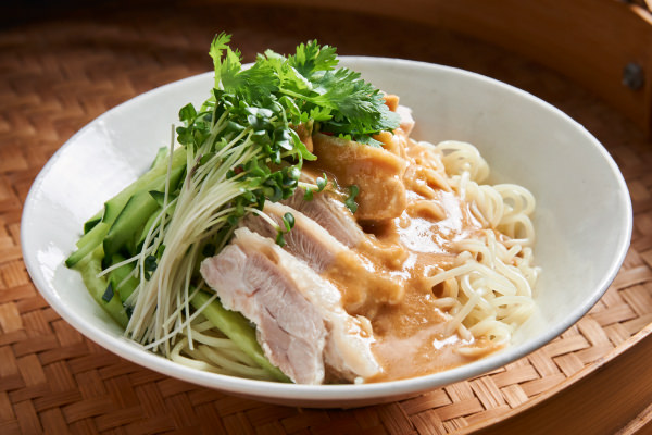- 麺を器に盛り、⑦、きゅうり、かいわれ大根、パクチーをのせ、上から、④のドレッシングをかける。
