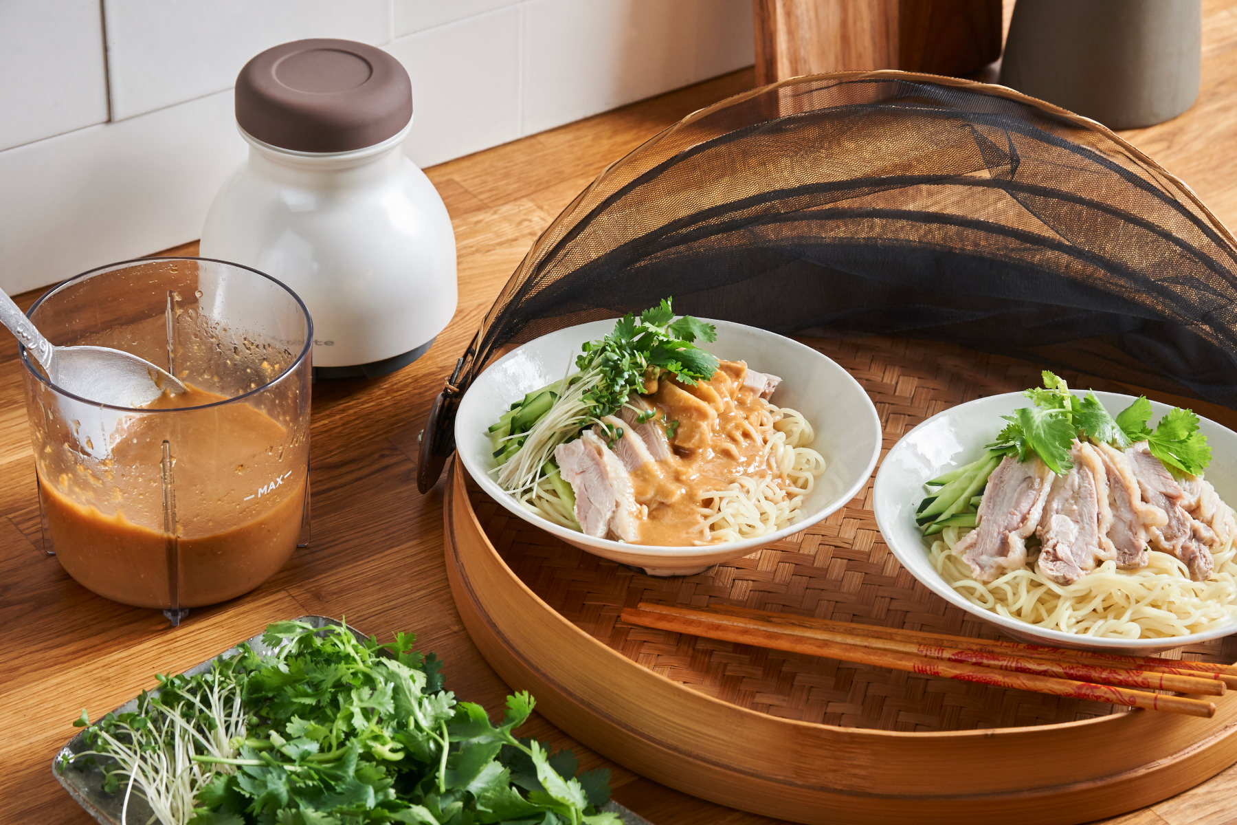 スタミナが欲しい季節。そんなときにおすすめしたいのがスタミナドレッシングの冷たいサラダ和え麺! 食欲がわかないようなときでもさっぱり食べられるから箸がすすみます。にんにくとみそをたっぷり使ったドレッシングは、材料を[カプセルカッター キャトル]で撹拌するだけ。ドレッシングが完成したら、蒸し鶏サラダののっけ麺にかけていただきます。スタミナたっぷりでコクのあるドレッシングは、他にも、しゃぶしゃぶサラダにかけたり、炒めたひき肉とあえて肉みそ風にしたり、麺つゆで伸ばしてそうめんのつけダレに…と、いろいろな料理に使える万能ドレッシングです!