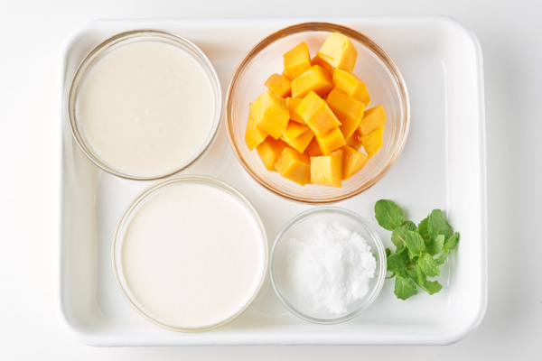 - 【甘酒でマンゴーアイス】の材料を準備する。