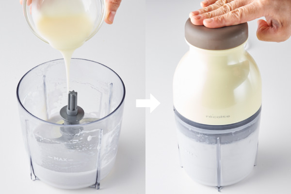 - ココナッツミルクと練乳を[カプセルカッター キャトル]に入れ、連続プッシュして、なめらかになるまで撹拌する。(POINT★3)