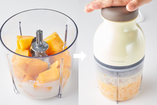 - 甘酒と適当な大きさに切ったマンゴーを[カプセルカッター キャトル]に入れ、なめらかになるまで撹拌する。