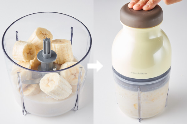 - 甘酒と適当な大きさに切ったバナナを[カプセルカッター キャトル]に入れ、連続プッシュして、なめらかになるまで撹拌する。