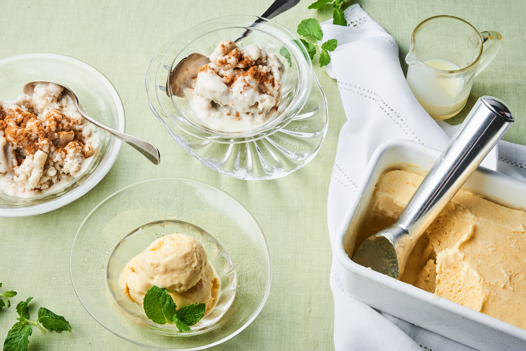 - ディッシャーなどで器に盛り、スペアミントを飾る。