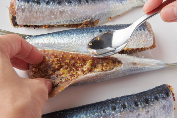 - イワシのお腹(内臓を取り除いた部分)に粒マスタードを塗る。