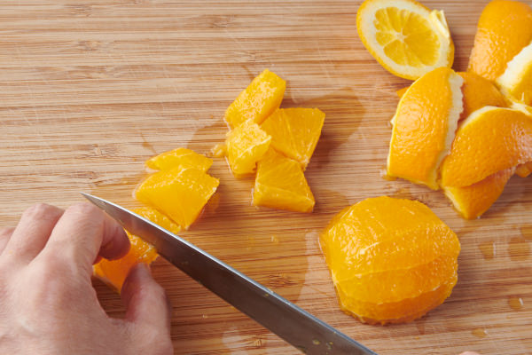 - オレンジは皮をむき、果肉を1〜2cm厚さのいちょう切りにする。種は取り除く。