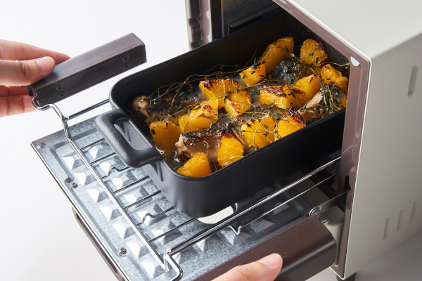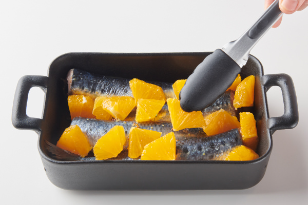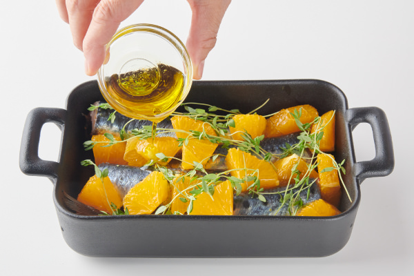 イワシをよく食べる国、スペインの料理をシンプルにアレンジした、見た目も華やかなバルつまみ。イワシとオレンジを[スライドラックオーブン デリカ]でグリルするだけの簡単レシピです。ふっくらと香ばしく焼きあがったイワシに、オレンジのやわらかな酸味のある果汁がソースのようにからんで爽やかな味わい。イワシのお腹に塗った粒マスタードが味のアクセントになり、臭みを消す効果も。