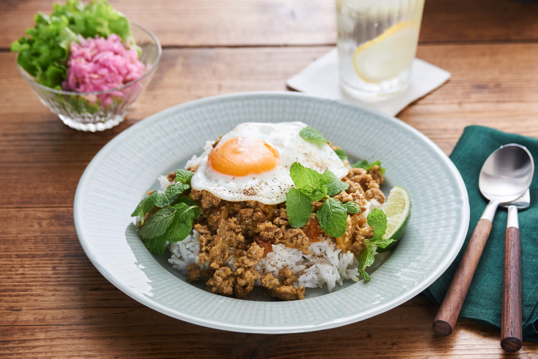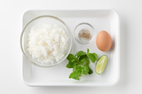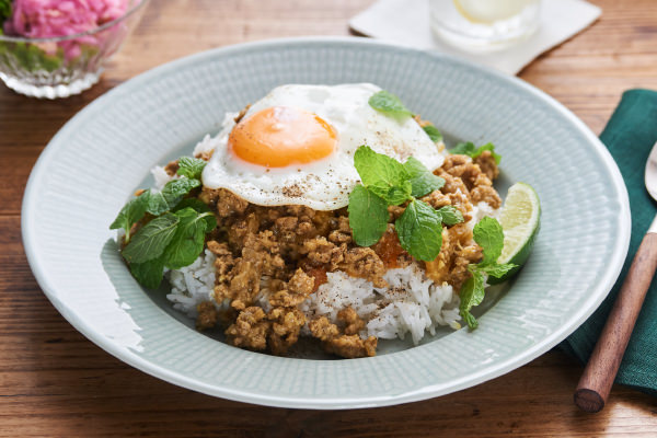 - 器にご飯を盛り、⑫をご飯にかけ、黒こしょうをふる。半熟目玉焼きをのせ、スペアミント、ライムを添える。