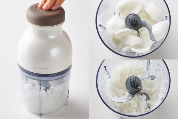 - 続けて、玉ねぎを[カプセルカッター キャトル]に入れ、数回パルスプッシュをしてみじん切りにする。ボウルなどに移す。(POINT★4)