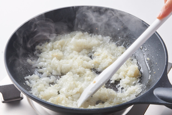 - 香りがたってきたら、④の玉ねぎを加え、中火にして炒める。
