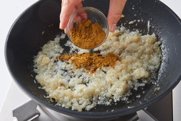 - 玉ねぎがしんなりとして、少し色づき始めたらカレー粉を加え、全体になじむまで炒める。(POINT★5)