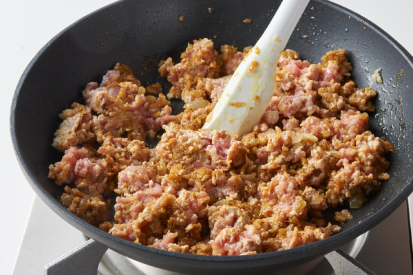 - ⑤の豚肉を加え、ほぐしながら、色が変わるまで炒める。