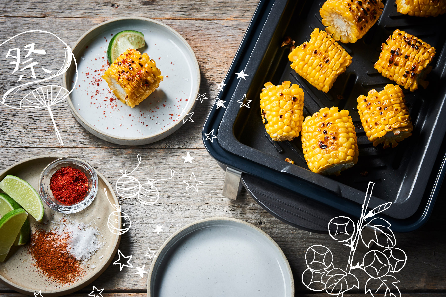 香りにつられて、お祭りでついつい買ってしまう焼きとうもろこしを[ホームバーベキュー]で。ラードを使って焼くと旨みが出て、食欲をそそる屋台の香りが漂います。チリパウダーやライム汁をふればメキシコ風の味で新鮮! おうちだから気にせず、ワイルドにかぶりついて!