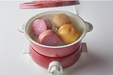 - [ポットデュオ フェット]本体に[セラミックボウル]と[蒸し料理用アミ]をセットし、水150ml(分量外)を入れる。アミの上にじゃがいもをのせてフタをする。