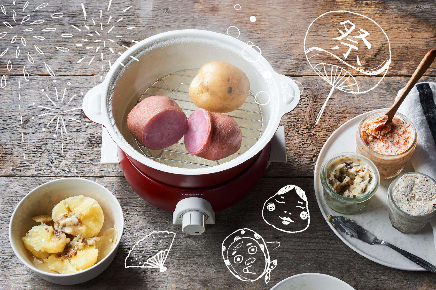 [ポットデュオ フェット]でふかしたじゃがいもは、ほっくほく。そこにバターをのっけるだけなのに格別のおいしさ! 今回はただのバターではなく、コク旨な「アンチョビ&ケイパーバター」、ぷちぷち食感にハマる「とびっこ&ディルバター」、旨みたっぷりの「きのこバター」の3種のバターソースをご紹介。村山さんならではのハッとさせられる食材の組み合わせと食感にやみつきです。